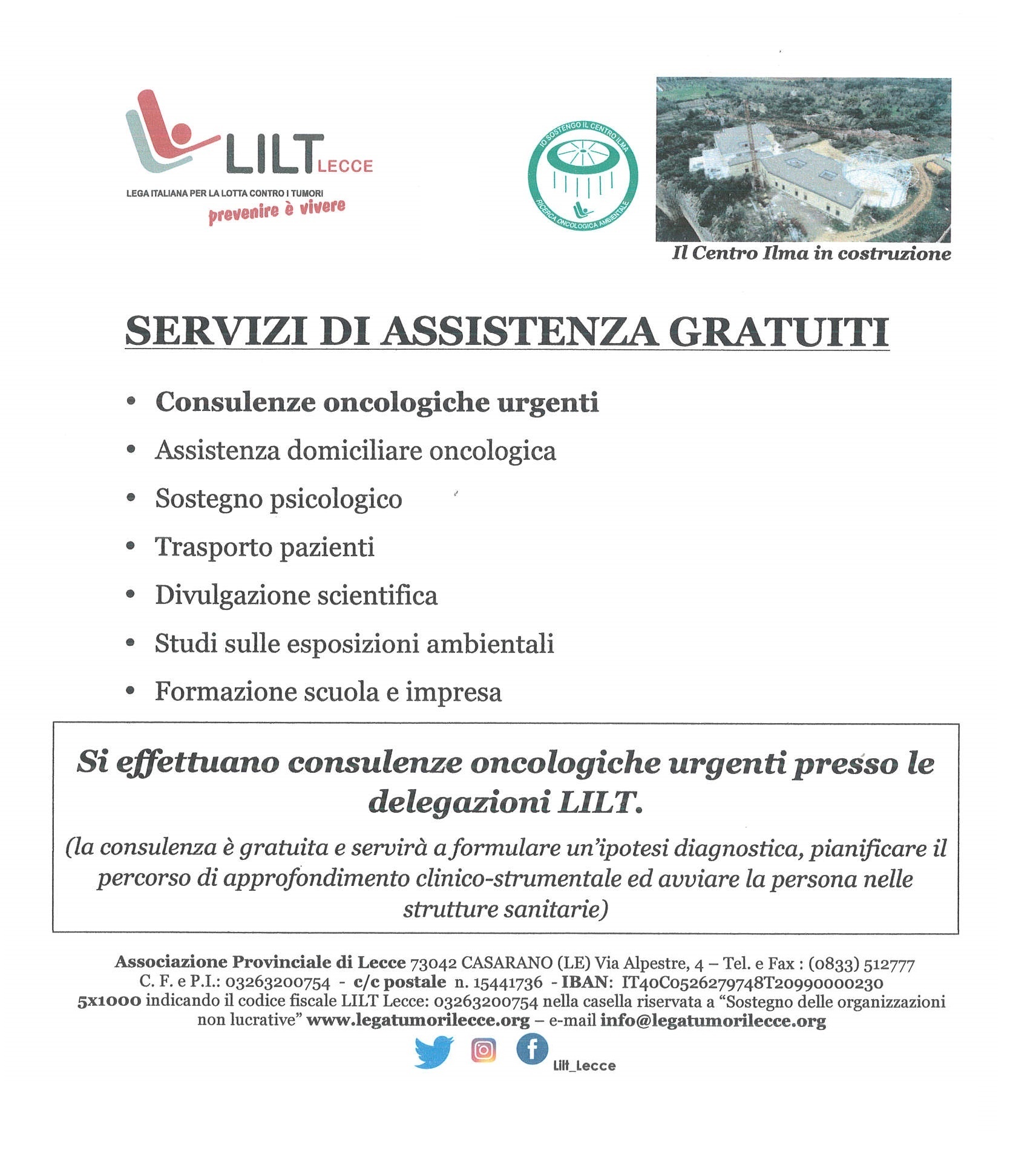 Servizi di assistenza gratuiti: Consulenze oncologiche urgenti; Assistenza domiciliare oncologica; Sostegno psicologico; Trasporto pazienti; Divulgazione scientifica; Studi sulle esposizioni ambientali; Formazione scuola e impresa