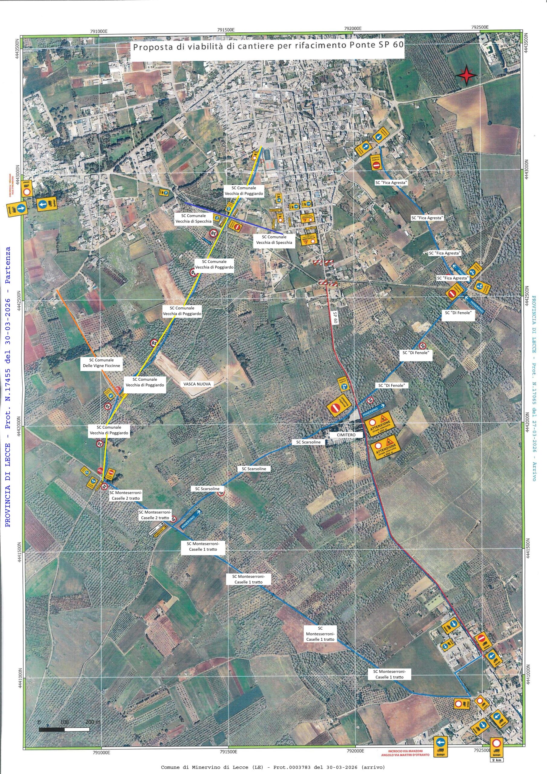 Dal 27 aprile 2026 sarà chiusa la circolazione all’intersezione S.P. 60 – via delle Rotonde (Minervino / Cocumola) per lavori di demolizione e ricostruzione del ponte. In allegato Ordinanza n. 17/2026 e planimetria con viabilità alternativa.